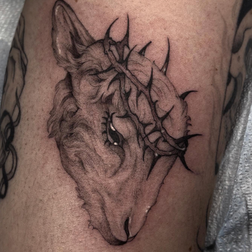 Death Nurse (she/her) is an Atlanta-based artist and tattooer originally hailing from Nashville, TN. She specializes in black and grey illustrative work and enjoys tattooing art history references, horror and monsters, medieval images and architecture, lady faces, birds, animals, botanicals, and abstraction. She has a background in printmaking, and is currently pursuing a history degree. She loves reading contemporary fiction and historical non-fiction, watching horror movies and Bravo reality shows, drawing, and co-hosting a podcast about the art and philosophy of art thefts and forgeries called Vanishing Point. She will tell you all about her 55 lb. pitbull, Darla Girl, and wants to pet your dog too.